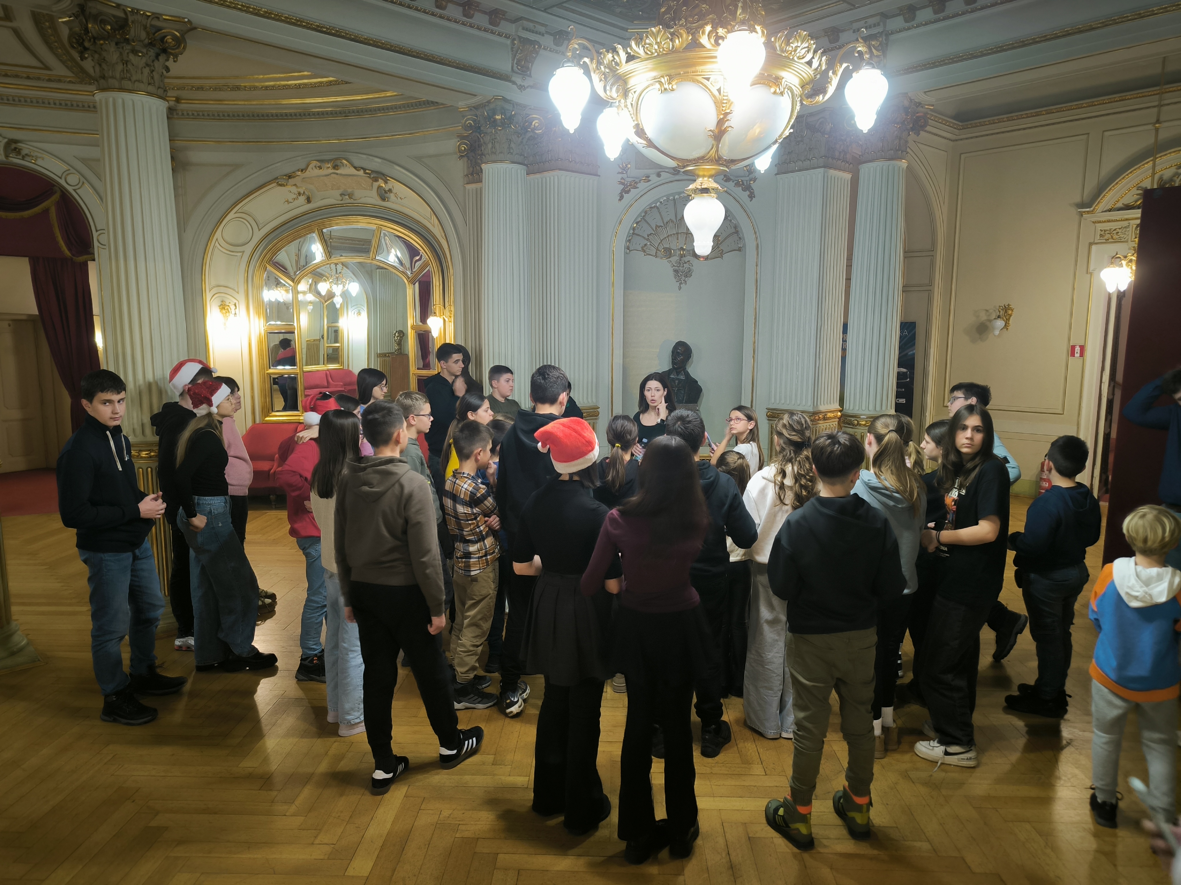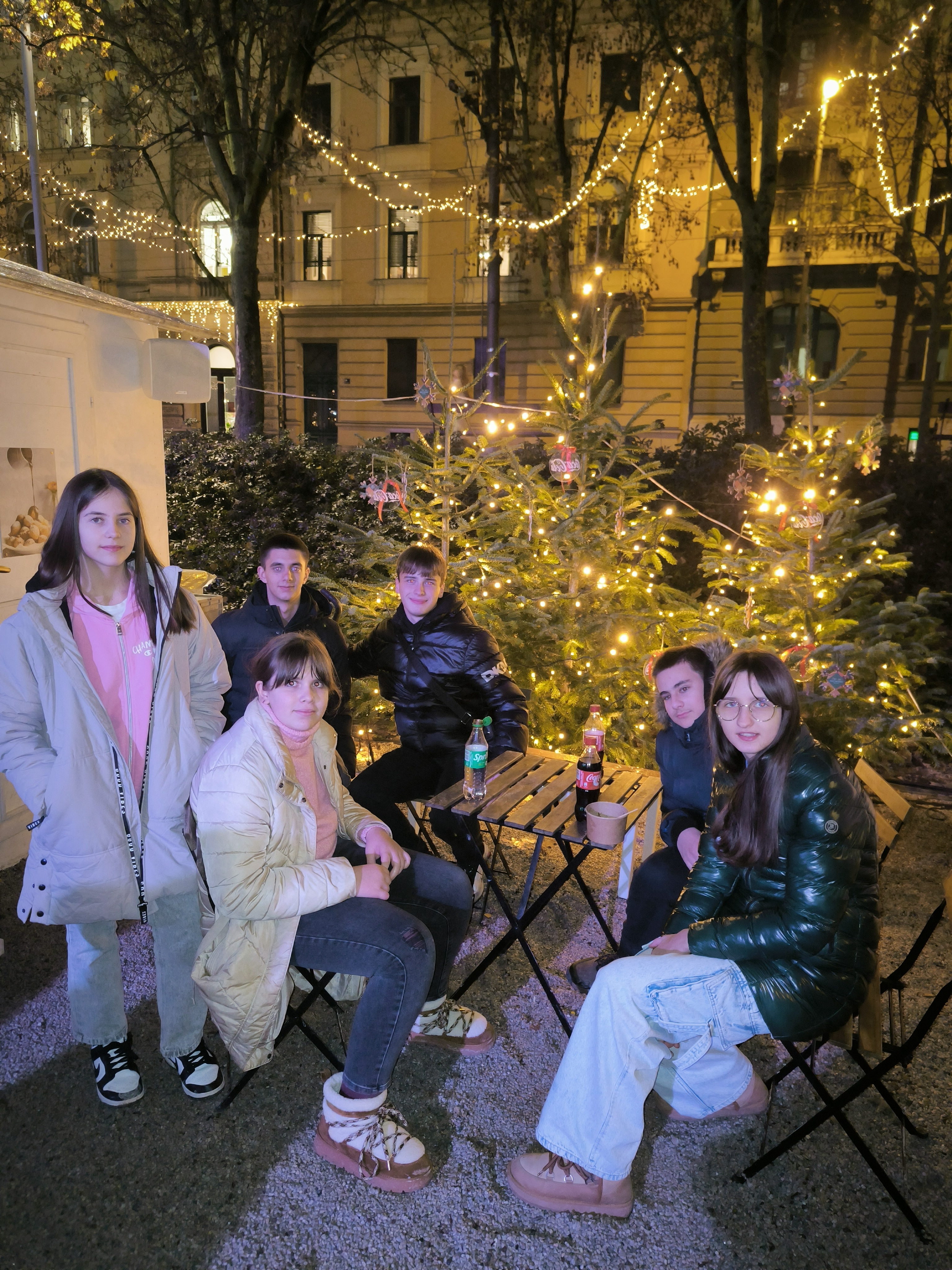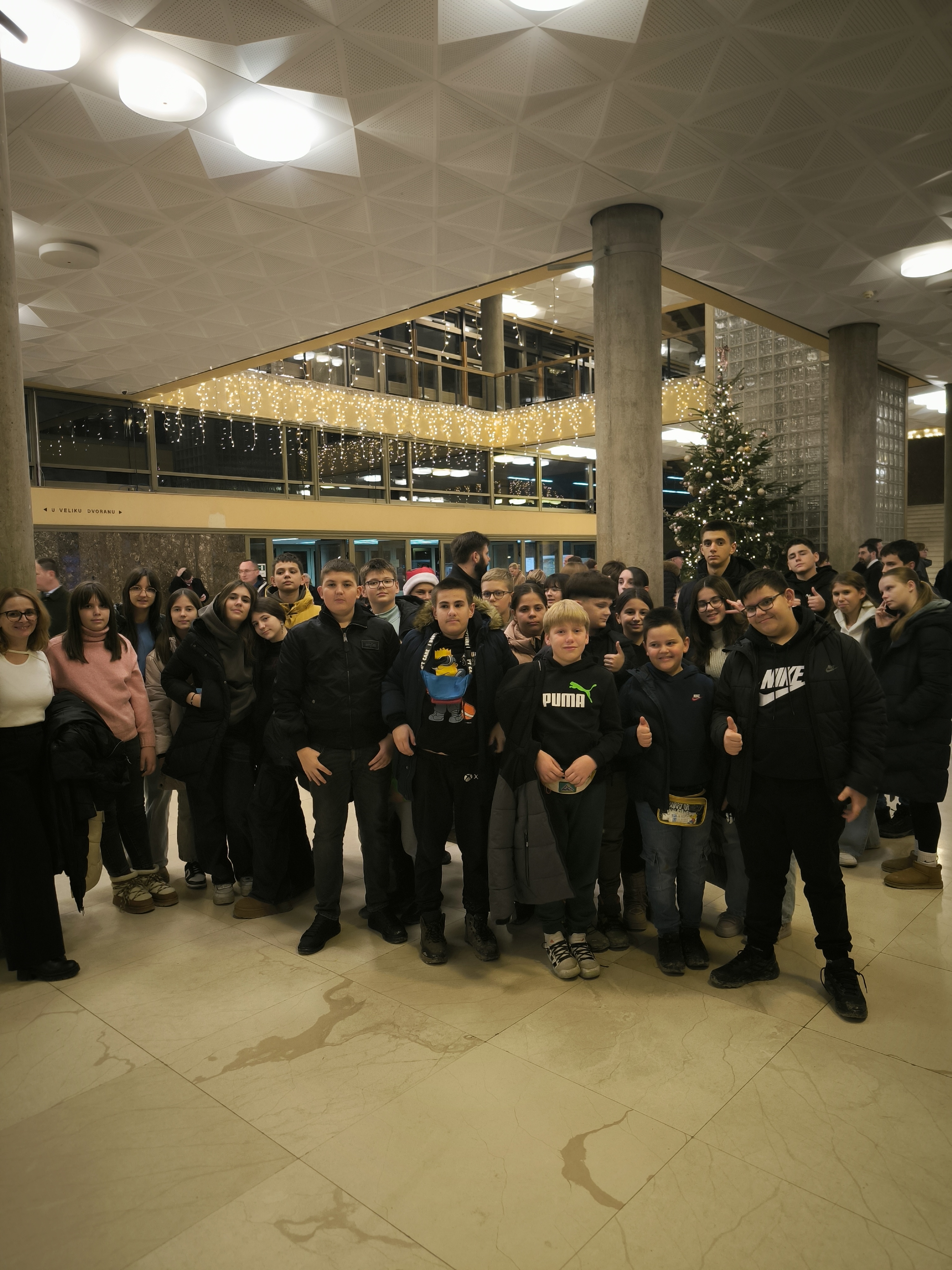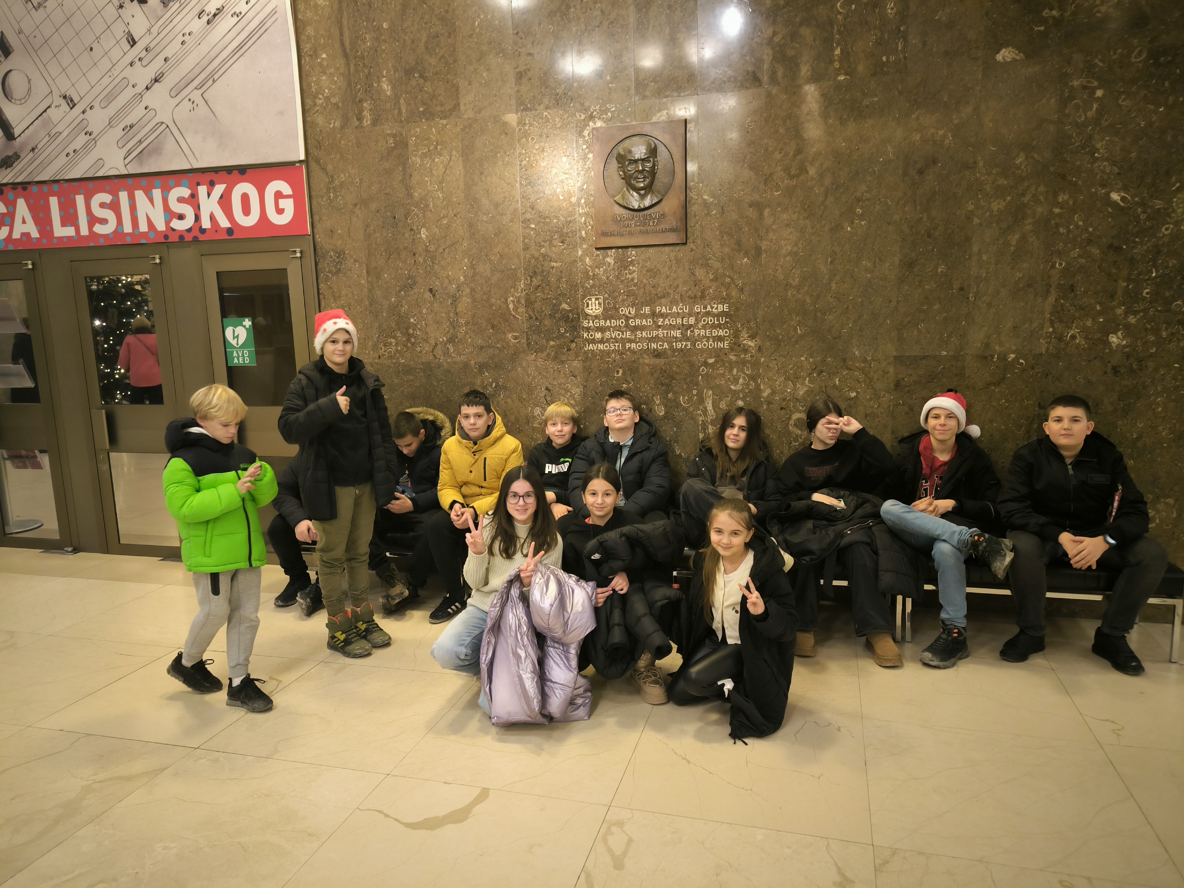 Prvi dio terenske nastave bio je posjet Hrvatskom narodnom kazalištu, jednoj od najvažnijih glazbenih institucija u Hrvatskoj. Učenici su uz stručno vodstvo razgledali povijesnu zgradu, zavirili iza kulisa, upoznali se s arhitekturom kazališta te zanimljivim povijesnim činjenicama. Posebno ih je impresionirala velika koncertna dvorana u kojoj su mogli zaviriti u prostor gdje je smješten orkestar, kao i u lože sa kojih se najbolje vidi pozornica. Nakon razgleda kazališta slobodno vrijeme iskoristili smo za posjet adventu i okrijepili se toplim napitcima. Zatim smo se uputili u Koncertnu dvoranu „Vatroslav Lisinski“ gdje smo slušali koncert Zagrebačke filhamonije i akademskog zbora Ivan Goran Kovačić.